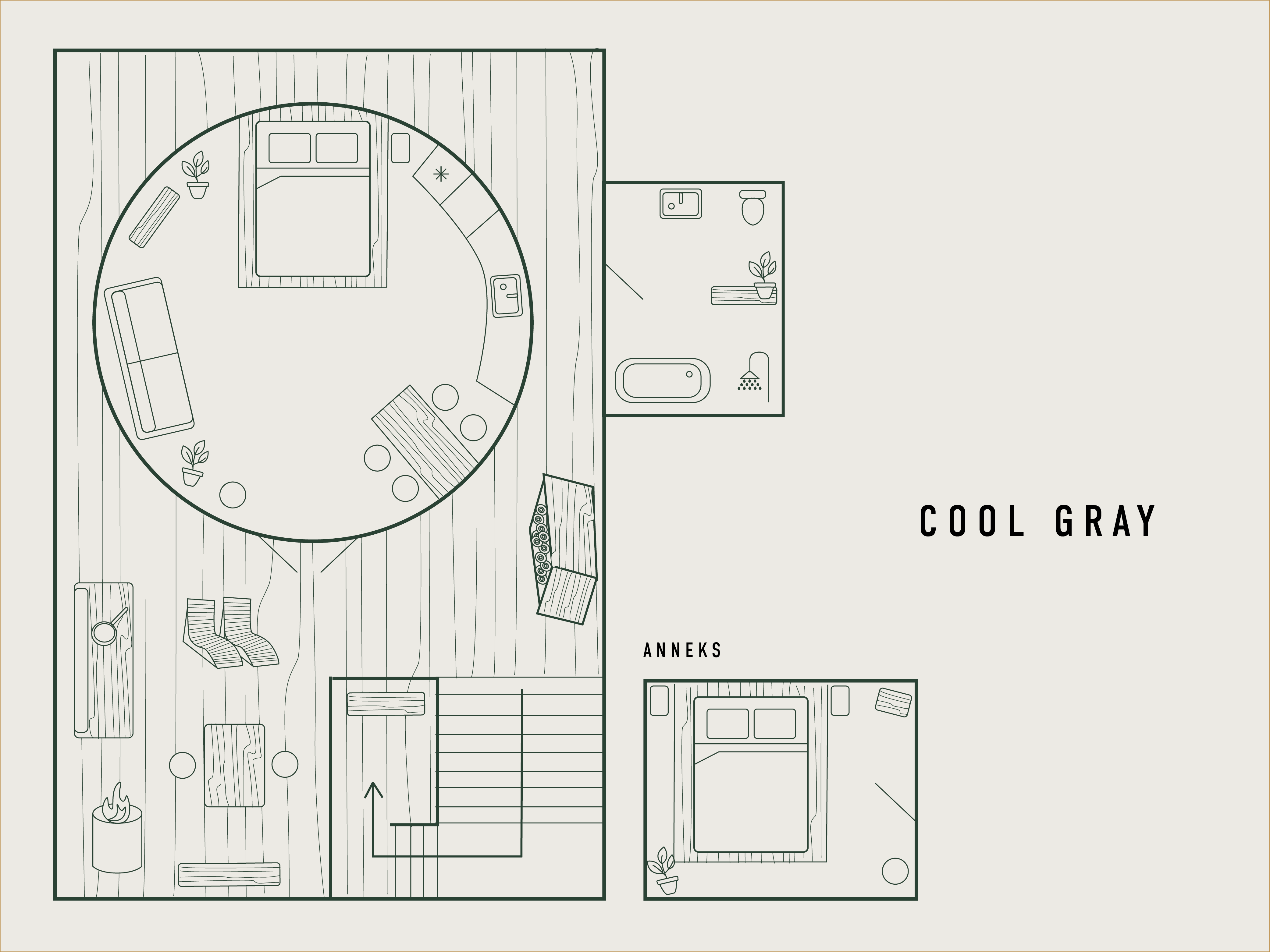 Cool Gray sleeps four guests across two double beds — one in the yurt itself and one in an annex beneath the terrace.