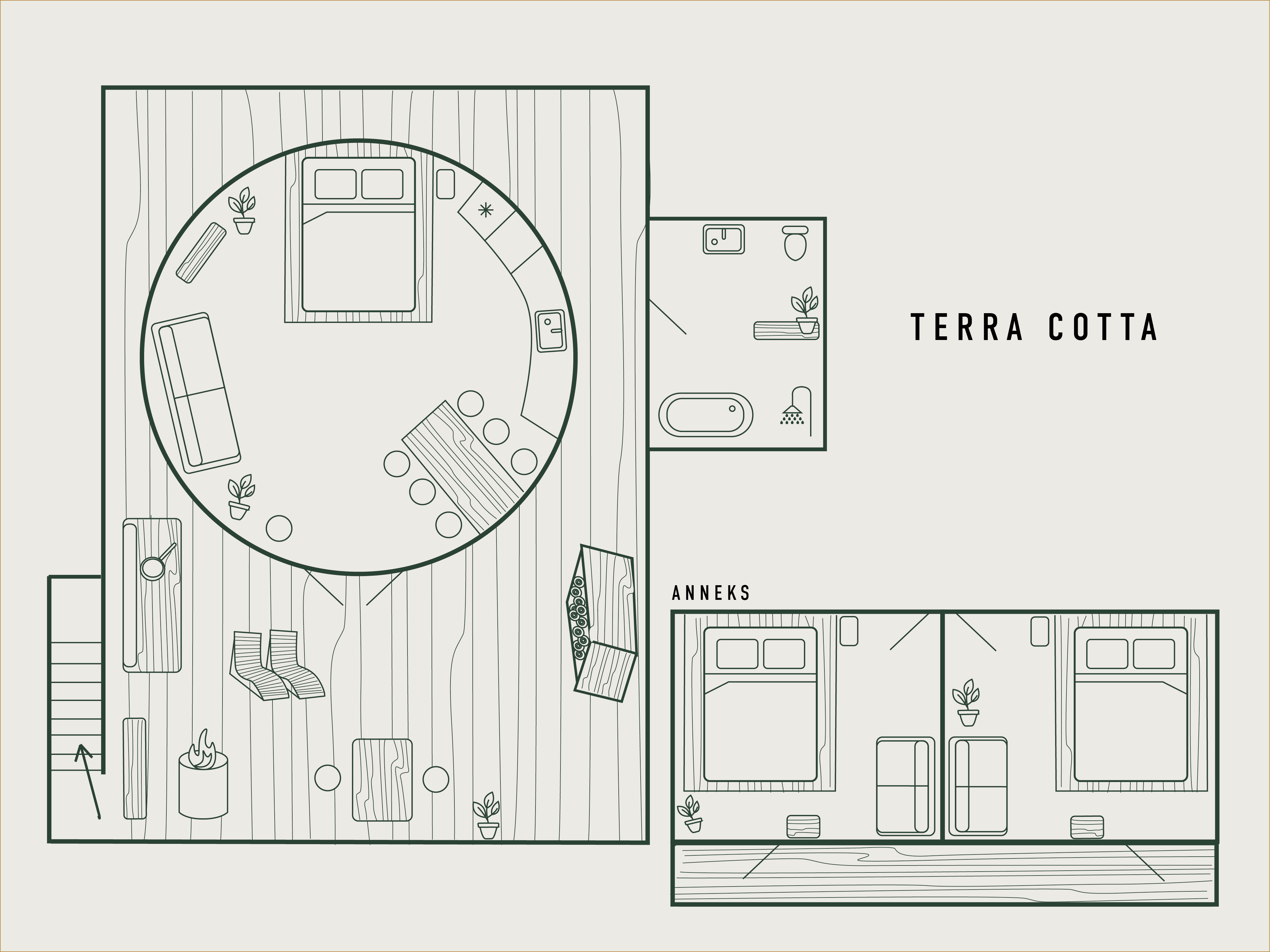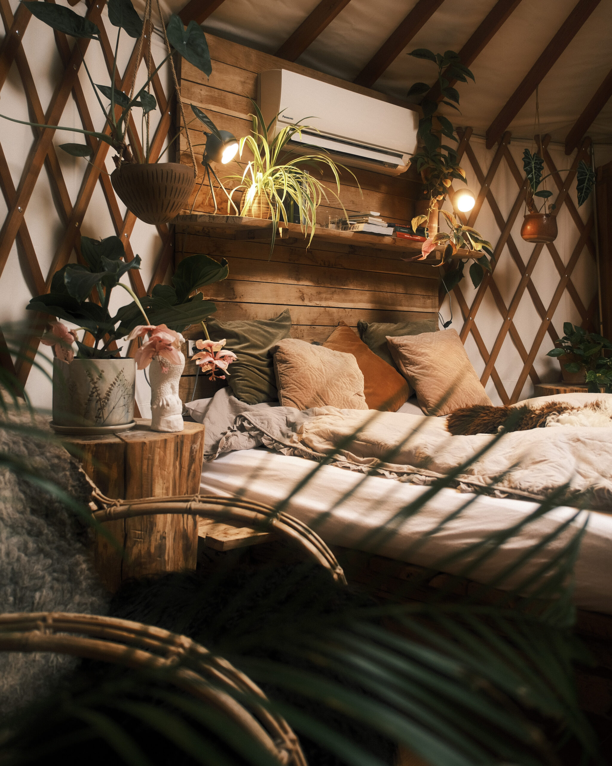 Terra Cotta and Forest Green can host six guests in three double beds — one in the yurt and two in annexes beneath the terrace.