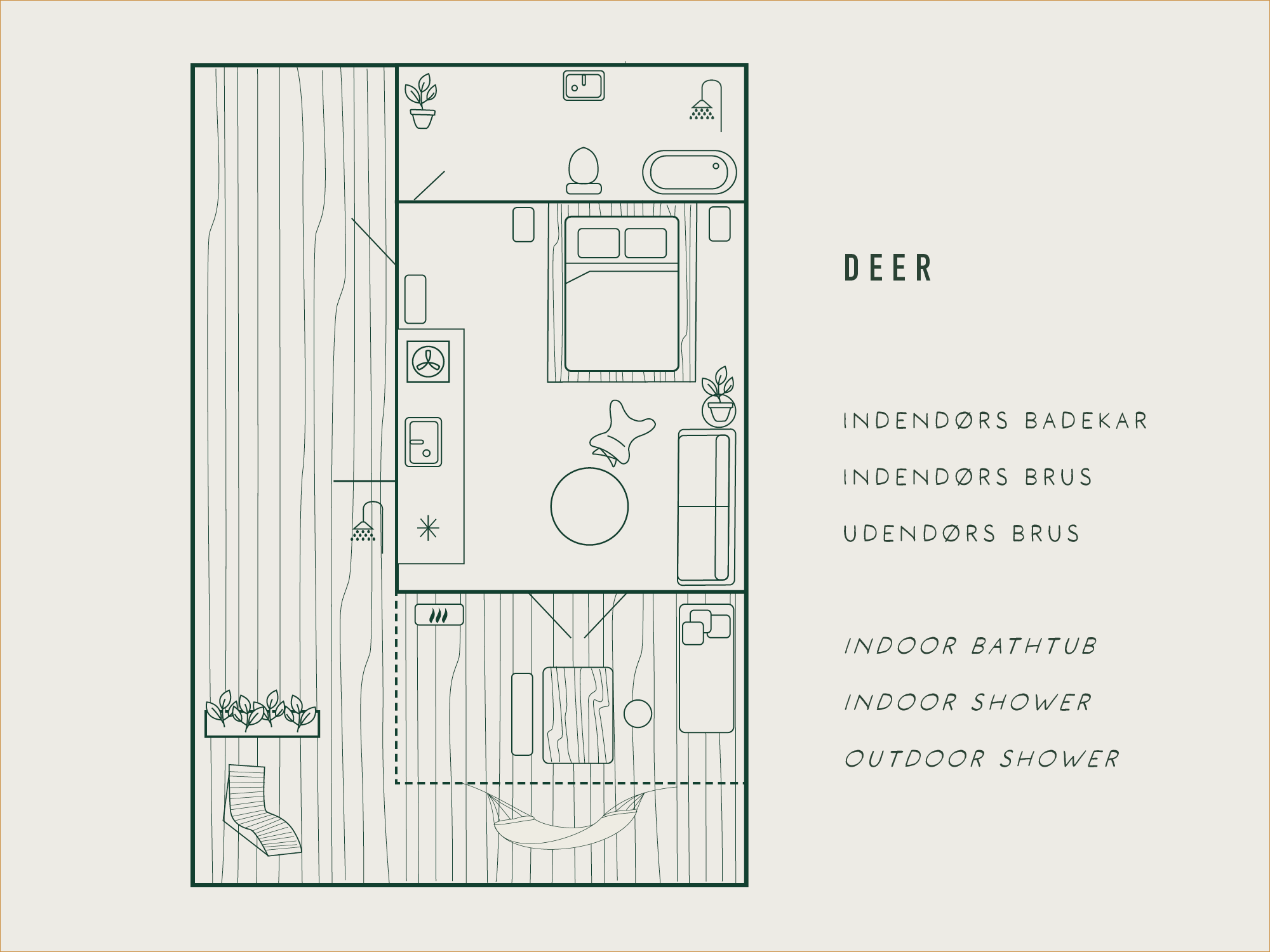 Welcome to our Valley Cabins, your oasis in the heart of one of Denmark’s most beautiful forests. Take a deep breath of fresh forest air and feel your shoulders drop as you arrive in the valley. Our cozy cabins are more than just a place to rest your head; they are a destination in themselves. Beautifully furnished and surrounded by a spacious terrace, the cabins open up to calming views of the landscape. In front of the terrace, fallow deer and red deer graze peacefully, while pheasants and hares curiously emerge from the undergrowth, placing you in close connection with nature in the forests of Gisselfeld Kloster. Discover the forest’s hidden treasures, and from the Forest Tower, rising among tall beech and oak trees, you can enjoy both sunrise and sunset from a front-row seat 45 metres above the ground. As the day draws to a close, fill the outdoor bathtub on the terrace and feel the evening dew settle as you relax, warm and comfortable, in the soothing water beneath a sky full of stars. Find your sense of calm right here, on the edge of the valley, surrounded by nature.
