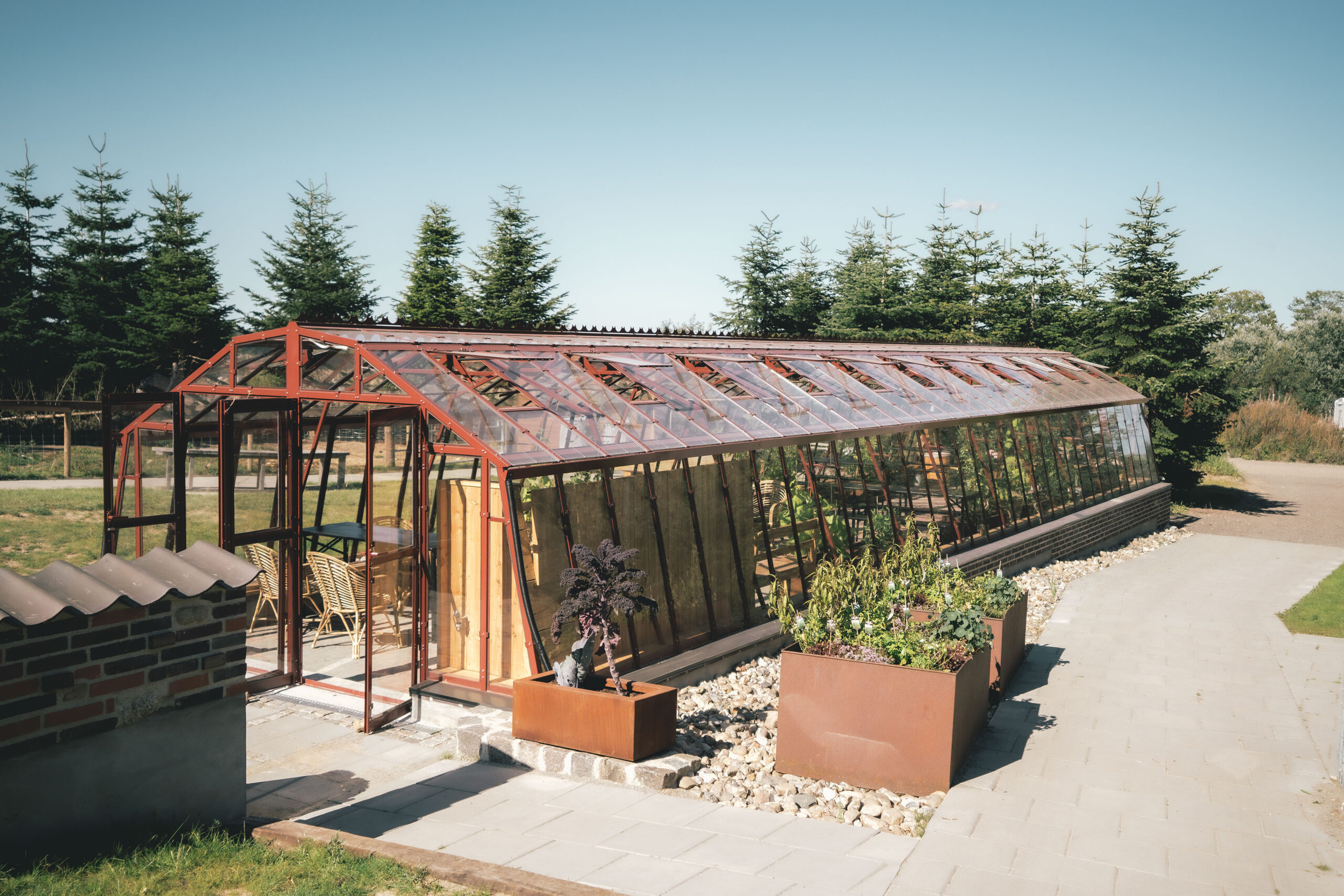 Væksthuset har taget form i løbet af sommeren og de første tomater og agurker er høstet fra rankerne. Her kan I slå jer ned i en blød stol og nyde kaffen til lyden af hønsene der kagler i baggrunden.